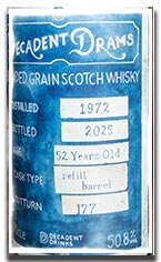 Blended Grain 1975, 52 ans d'âge, Decadent Drinks, 50,8 %, B:2025. Prix: Couleur : Vieil or ambré Nez : Très moelleux, céréalier, avec des notes de porridge, de doux arômes de céréales cuites, de vernis, d'esters et de fruits exotiques mûrs (banane, noix de coco et mangue) et de cuir souple. Très agréable. Goût : Doux à très doux, fruité, légèrement parfumé, sur des notes de fruits exotiques mûrs, de céréales cuites, de crème anglaise à la vanille et une pointe de vernis. La finale est moyennement longue, douce, légèrement onctueuse, sur des arômes de caramel mou, de miel de bruyère, de mangue, de vanille, de cannelle et de porridge. Impression : Un whisky de grain très doux et moelleux, avec des notes de fruits exotiques, de vanille et de porridge. Agréable, même si j'aurais souhaité plus d'intensité. Score: 14/20 |