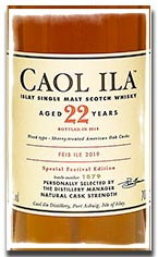 Caol Ila Feis Ile 2019, 22 YO, OB, 58.4%, B:2019. Price: Colour: Gold Nose: Round, complex, balanced, smoky, maritime, on a nice mellow peat smoke, some iodine, seaweeds, hemp rope and tar. Taste: Mellow, complex, elegant, smoky, peaty, maritime, slightly medicinal, with some peat smoke, tar, menthol and seaweeds. The finish is long, complex, mellow, balanced, rather elegant, on iodine, disinfectant, TCP and a touch of menthol. Impression: A rather mellow and balanced expression of Caol Ila, rather medicinal and with some menthol. The peat smoke is rather moderate. Rating: 15/20 |
